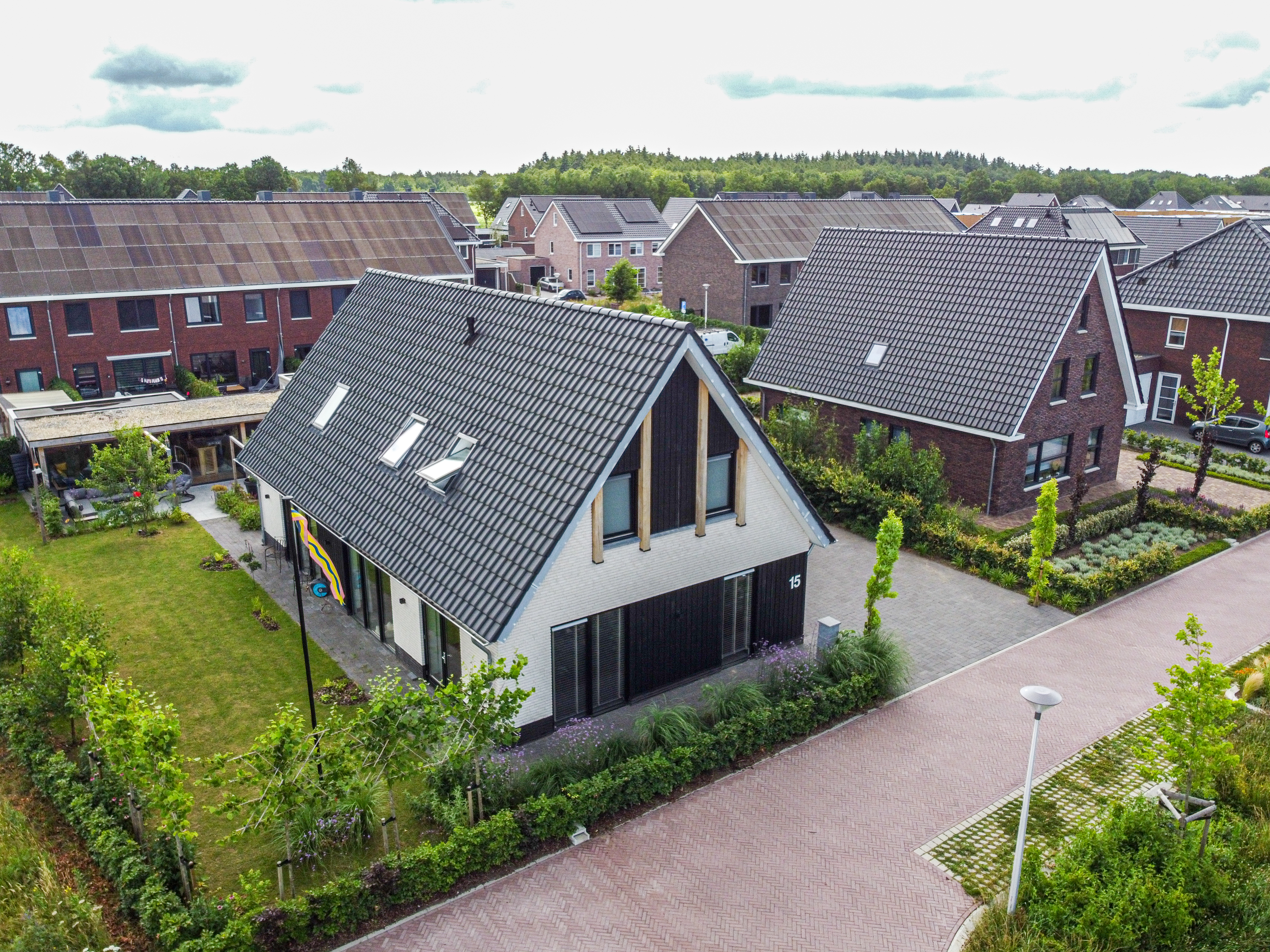 Het ontwerp speelt met een ingetogen materiaalpalet en heldere lijnen: robuust metselwerk, houten accenten en een diepgelig dak vormen samen een tijdloze uitstraling. Slim geplaatste ramen en een open indeling zorgen voor veel daglicht en zicht op het omringende groen, terwijl technische keuzes bijdragen aan energiezuinigheid en toekomstbestendigheid.