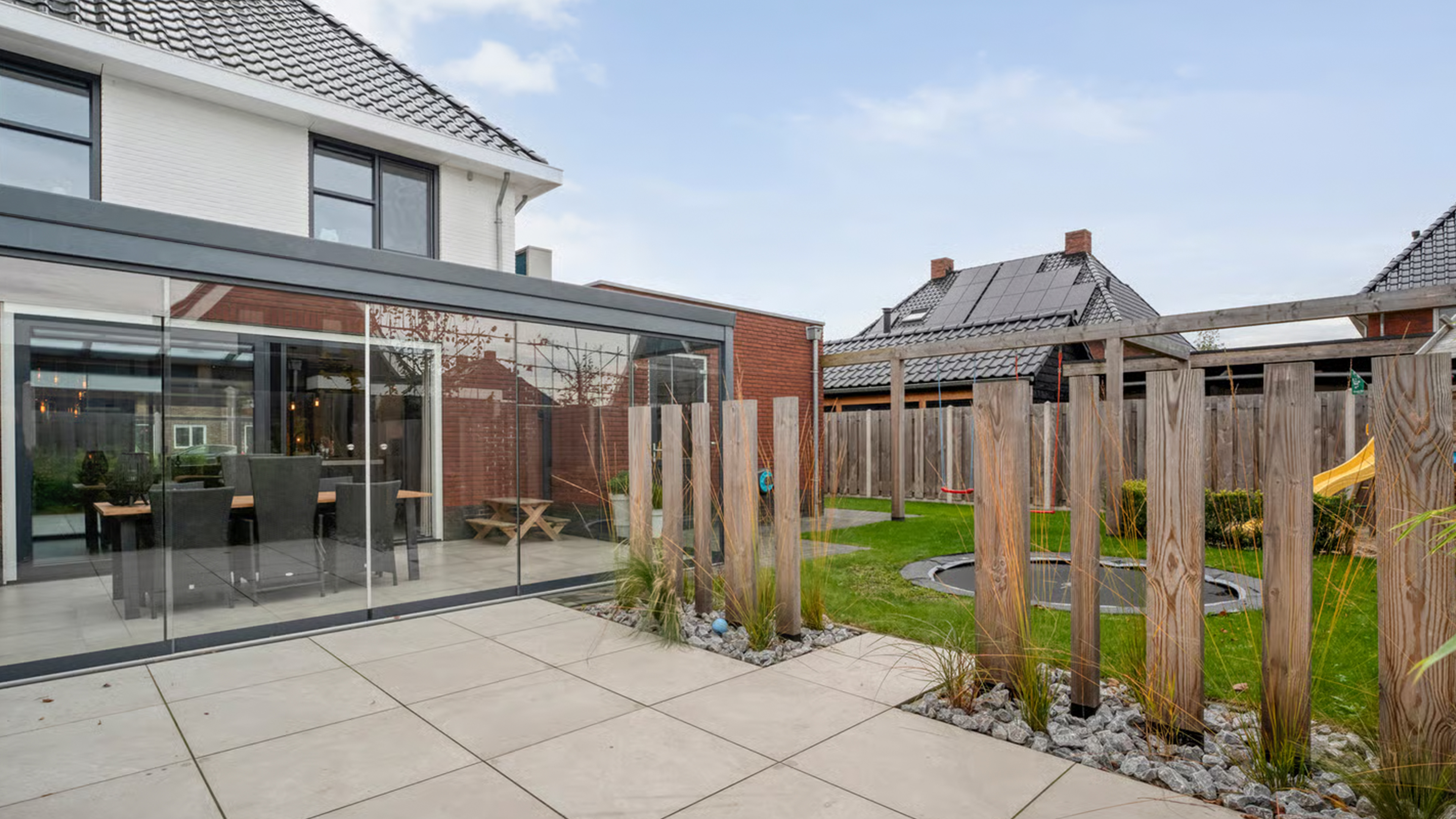 De indeling is praktisch en licht: ruime woonkamer, uitgebouwde woonkeuken met eiland en grote schuifpui naar een royale veranda. Aangrenzend bevinden zich bijkeuken en geïsoleerde garage met praktische inbouwoplossingen. De diepe, verzorgde achtertuin biedt veel speelruimte en privacy.